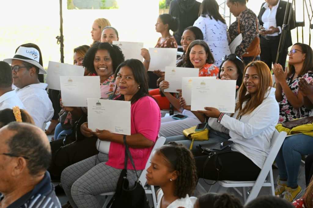 A La Vista RD, Higüey.– Mujeres víctimas de violencia de género, madres solteras o jefas de hogar, así como familias receptoras de niños y niñas huérfanas por feminicidios de Higüey, provincia La Altagracia, recibieron este sábado las llaves de sus nuevas viviendas, en el marco de la quinta entrega del Plan Nacional de Viviendas Familia Feliz.